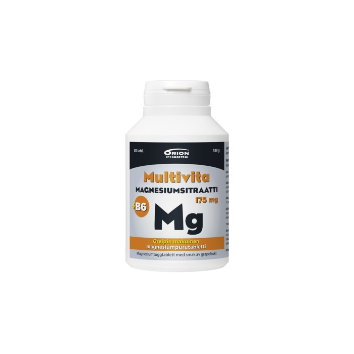 Multivita Magnesiumsitraatti+B6 175 mg on vahva magnesiumsitraattipurutabletti sekä urheilijan ja kuntoilijan luottotuote! Yksi raikkaan greipin makuinen purutabletti sisältää 175 mg magnesiumia hyvin imeytyvässä sitraattimuodossa sekä 2 mg magnesiumin imeytymistä tukevaa B6-vitamiinia. Helposti suussa hajoavassa purutabletissa on miellyttävä rakenne, eikä se jätä jauhoista tai rakeista suutuntumaa. Tuotteen sisältämä magnesium vähentää väsymystä ja uupumusta, edistää energia-aineenvaihduntaa ja tukee lihasten ja hermoston normaalia toimintaa. Kaikki sarjan tuotteet sopivat myös vegaaneille. Laktoositon (maidoton), gluteeniton, hiivaton ja sokeriton. Makeutettu ksylitolilla, sorbitolilla ja sukraloosilla. Ravintolisä.