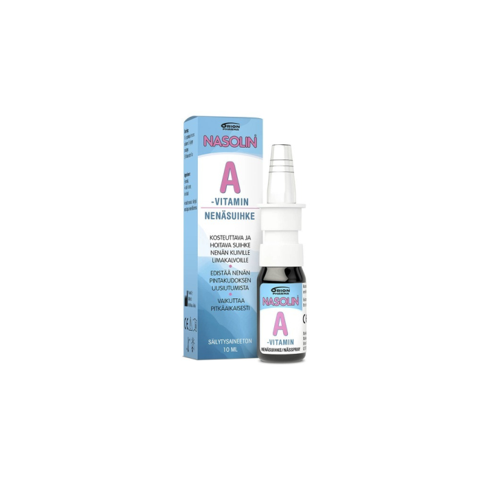 Nasolin A-vitamin nenäsuihkeet ovat kosteuttavia ja hoitavia nenäsuihkeita, jotka sisältävät seesamiöljyä ja A-vitamiinia. Ne kosteuttavat ja hoitavat kuivia nenän limakalvoja ja auttavat niitä pysymään terveinä. Säilöntäaineettomia. Kehitetty ja valmistettu Suomessa. Nasolin A-vitamin nenäsuihkeet ovat CE-merkittyjä lääkinnällisiä laitteita, CE0537, valmistaja Pharmia Oy.