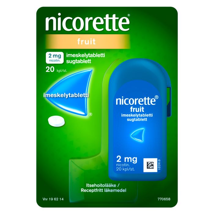 Nicorette Fruit-imeskelytabletit sisältävät nikotiinia, joka lievittää tupakanpolton lopettamiseen liittyviä vieroitusoireita ja nikotiinihimoa.